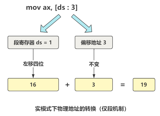 CPU计算物理地址的方式,段基址左移四位,再加上偏移地址。