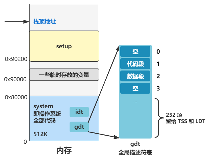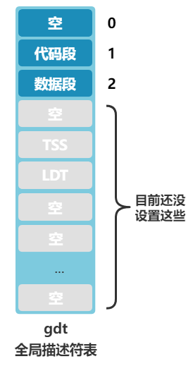 也是有代码段描述符和数据段描述符,然后第四项系统段描述符并没有用到,不用管。最后还留了 252 项的空间,这些空间后面会用来放置任务状态段描述符 TSS 和局部描述符 LDT,这个后面再说。
