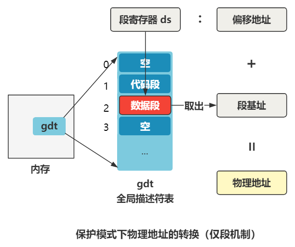 段基址取出来,再和偏移地址相加,就得到了物理地址,整个过程如下。