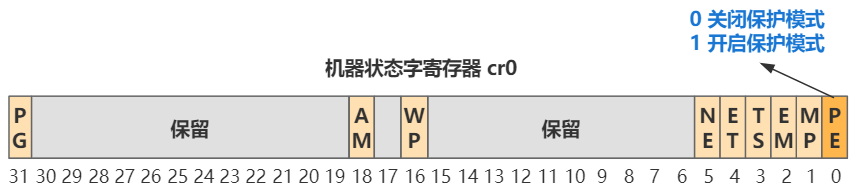 前两行,将 cr0 这个寄存器的位 0 置 1,模式就从实模式切换到保护模式了。
