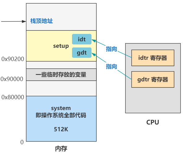 这里我把 idtr 寄存器也画出来了,这个是中断描述符表,其原理和全局描述符表一样。全局描述符表是让段选择子去里面寻找段描述符用的,而中断描述符表是用来在发生中断时,CPU 拿着中断号去中断描述符表中寻找中断处理程序的地址,找到后就跳到相应的中断程序中去执行,具体我们后面遇到了再说。